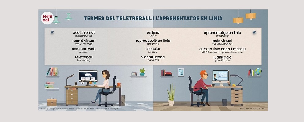 El TERMCAT presenta en una nova infografia interactiva alguns dels termes més freqüents vinculats al teletreball i a l'aprenentatge en línia. S’hi poden trobar termes com ara seminari web (en anglès, webinar), silenciar (una de les alternatives a to mute), videotrucada (en lloc de video call) o ludificació (la proposta adequada en lloc de gamification).