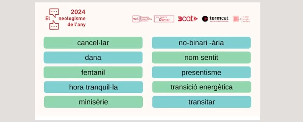 Ja ha començat el període de votació per escollir el neologisme de l’any 2024 en llengua catalana. L’Observatori de Neologia de la Universitat Pompeu Fabra, la Secció Filològica de l’Institut d’Estudis Catalans, el TERMCAT i 3Cat han engegat l’onzena edició de la campanya del Neologisme de l’any.