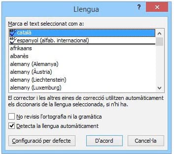 Per a canviar la llengua definida per defecte en els documents nous, només cal prémer el botó «Configuració per defecte» i el canvi de llengua, en principi, ha de quedar registrat a la plantilla Normal.dot, que és on es desen els canvis que fem en la configuració del programa.