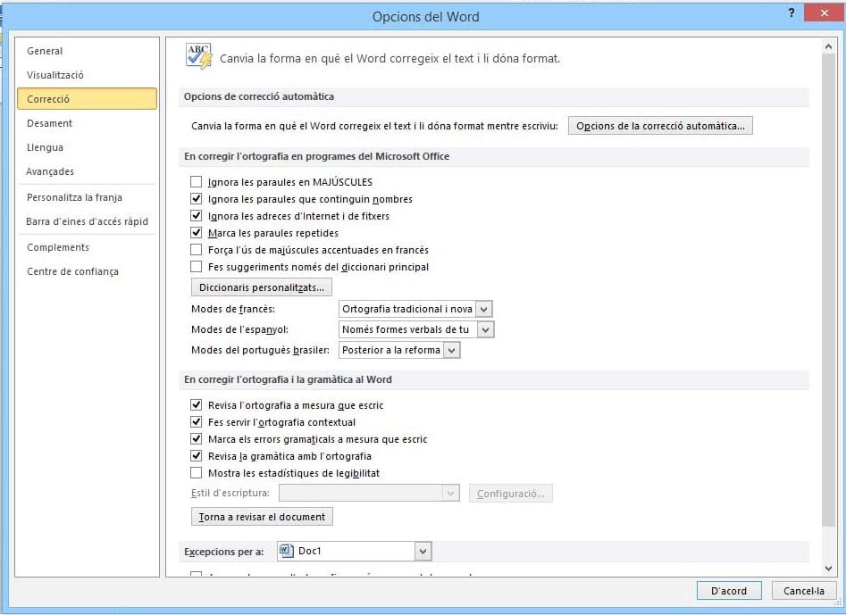 - «Ignora les paraules en MAJÚSCULES». Omet els mots escrits amb majúscula. És millor que no estigui seleccionat, perquè evitarem la possibilitat de deixar passar un error en un títol de document o d’apartat escrit amb majúscula.