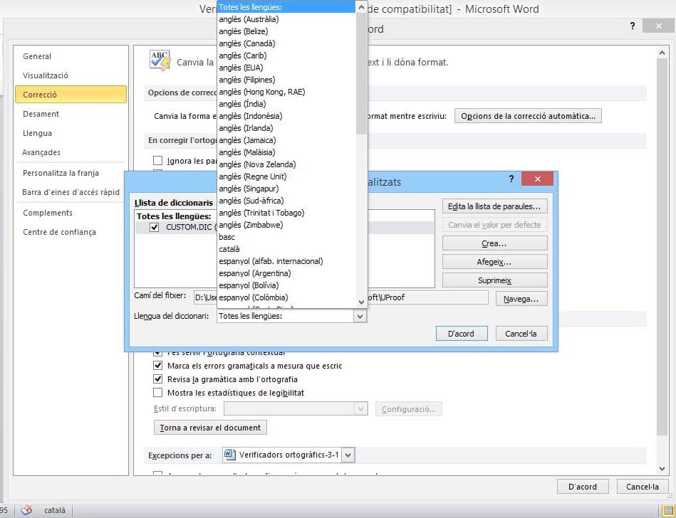 Per a associar un diccionari personalitzat a una llengua determinada, canviem el paràmetre a la part inferior del quadre de diàleg, que per defecte està associat a totes les llengües.